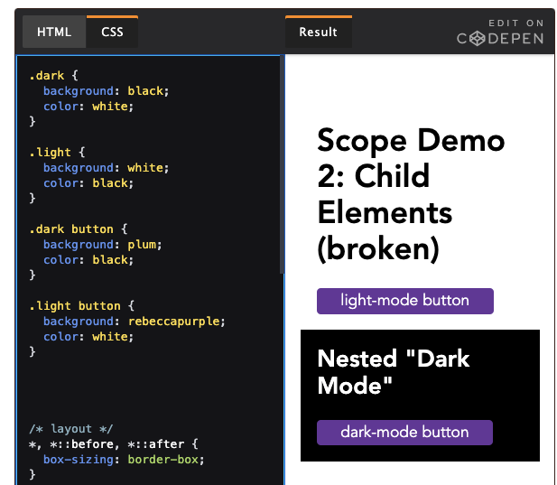 .dark { --btn-color: plum; --btn-contrast: black; } .light { --btn-color: rebeccapurple; --btn-contrast: white; }See the Pen 3 - Scope: Child Elements by Miriam Suzanne (@mirisuzanne) on CodePen.