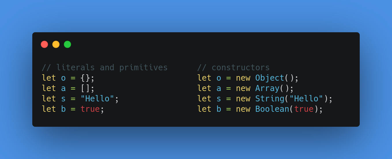 Literals and primitives | Built-in constructors let o = {}; | let o = new Object(); let a = []; | let a = new Array(); let s = “”; | let s = new String(); let n = 0; | let n = new Number(); let b = false; | let b = new Boolean(); let reg = /[a-z]/g; | let reg = new RegExp( "[a-z]", "g" ); throw { | throw new Error(“oops... error”); name: “Error”, message: “oops... error” }; throw Error(“oops... error”);출처 : https://medium.com/javascript-in-plain-english/javascript-constructors-vs-literals-2d19e8b5f2d9